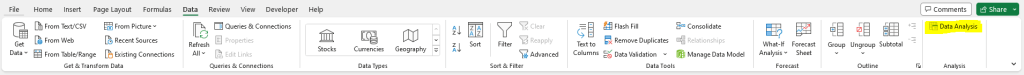 The Data Analysis button sits on the very right of the top ribbon in Excel under the Data sub heading, and looks like the below: