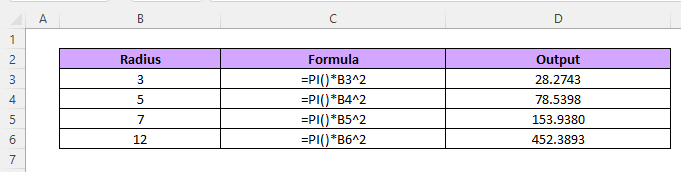 As we can see, by simply using PI() as the formula it makes life a fair bit easier than typing out 3.14…. and so on in the formula itself.